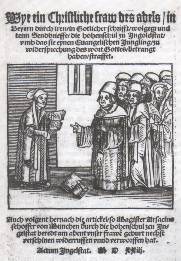 Uma antiga xilogravura do século XVI retratando Argula com uma Bíblia na mão, com seus tomos de teologia, enfrentando um grupo de acadêmicos evidentemente intimidados e desconcertados.