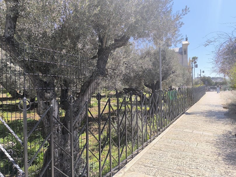 No Jardim do Getsêmani, existem oito oliveiras muito antigas e grandes. Além delas, há outras oliveiras, totalizando um conjunto de vinte e três árvores; possui cerca de 1.200 metros quadrados de área.